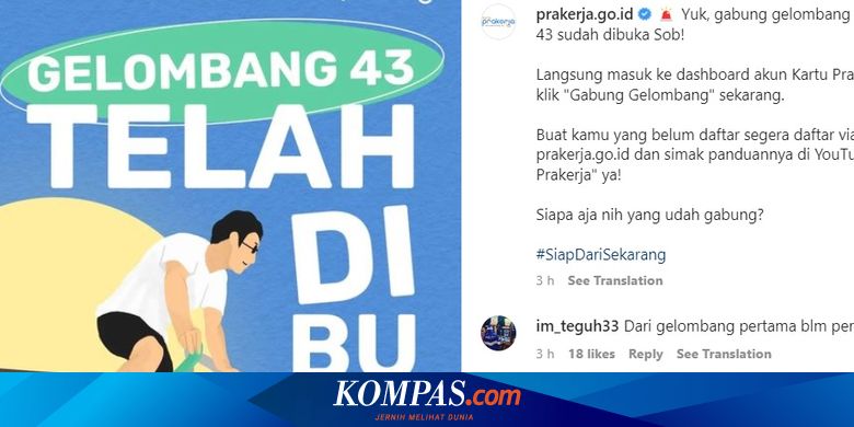 “Yuk, gabung gelombang yuk! Gelombang 43 sudah dibuka Sob! Langsung masuk ke dashboard akun Kartu Prakerja kamu dan klik "Gabung Gelombang" sekarang,” tulis unggahan di akun Instagram @prakerja.go.id.